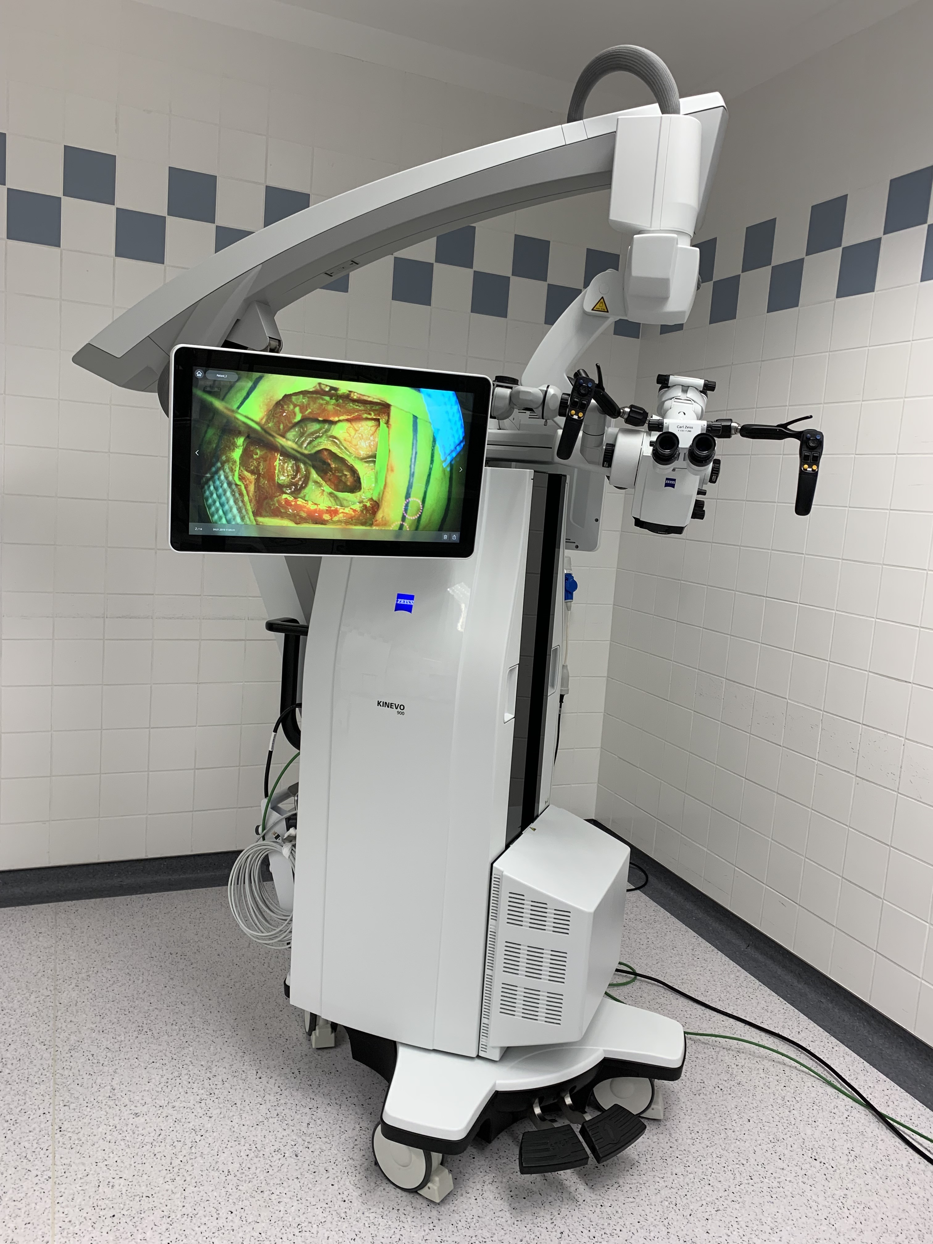 - Zwei erstklassige OP-Mikroskope (Zeiss Pentero und Kinevo), mit digitaler Auflösung und Bildbearbeitung, verfügen über neueste Module, die die vaskuläre Chirurgie (Red 800) und Tumorchirurgie (Blue 400 und Yellow 560) unterstützen und optimieren.