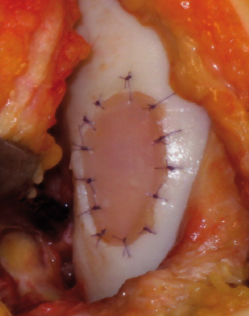 Anschließend werden die gezüchteten Knorpelzellen ausgestanzt und mit einer Pinzette passgenau übertragen. Individuell wird dann entschieden, ob das “Knorpelpflaster“ mit resorbierbaren Nähten eingenäht oder mit kleinen, ebenfalls resorbierbaren Ankerstiften (Minipins) fixiert wird. Das für die Transplantation verwendete Trägermaterial, das Nahtmaterial und die Minipins lösen sich im Gelenk im Laufe mehrerer Wochen vollständig auf.