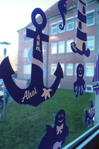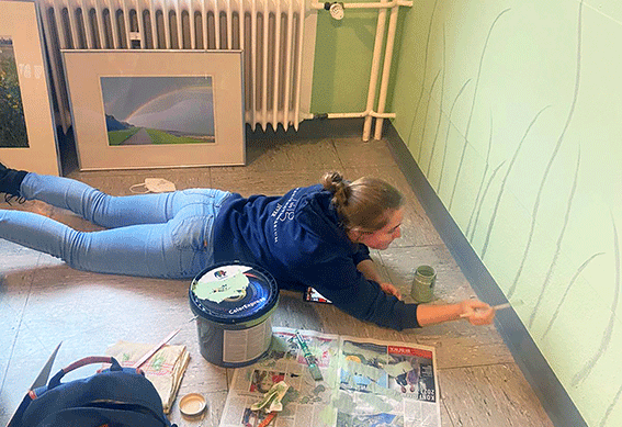Gestaltet wurde das Zimmer von jungen Menschen, die bei uns ihr Freiwilliges Soziales Jahr (FSJ) absolvierten. Bei der Farbgestaltung der Wände haben sie sich an der Natur orientiert und selbst den Pinsel geschwungen. Die Bilder an den Wänden zeigen Motive aus der Region. „Pril-Blumen“ aus den 70er Jahren verzieren die Schränke der Küchenzeile.