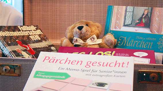 Da Nachhaltigkeit ein wichtiger Aspekt bei der Umsetzung des Projektes war, wurde nur bereits vorhandenes Mobiliar verwendet, das den Zeitgeist der 60er- und 70er-Jahre wiederspiegelt. Viele Mitarbeiter spendeten Gegenstände aus der „alten Zeit“. Nun sorgen ein Nähkästchen, ein altes Radio oder ein grünes Telefon für eine vertraute Atmosphäre. Ein rustikaler Tisch lädt zum Verweilen ein und bietet Platz für mehrere Personen. Alte Bücher zum Vorlesen und Gesellschaftsspiele runden das Angebot ab. Darüber hinaus haben die FSJ-lerinnen in Eigenregie Spiele zur Sinnesaktivierung gefertigt und sich weitere Beschäftigungsmöglichkeiten ausgedacht.